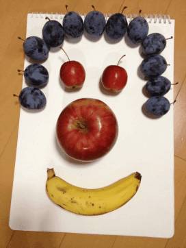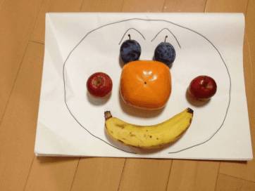 ピコポンが寝た後、ママがりんごを並べて顔を作ったりしているのを見て、パパも参加